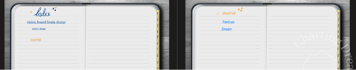 I like creating custom indexes for my Journals. That way I can easily jump to various sections. In this Journal I grouped it by regular Journal entries, Dreams and my Yearly Vision Board Brain dump.