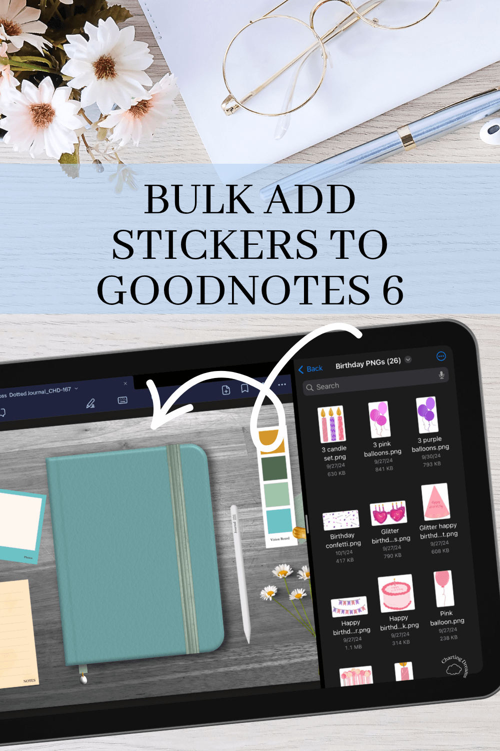 In split screen on your iPad open the PNG folder and your planner in Goodnotes