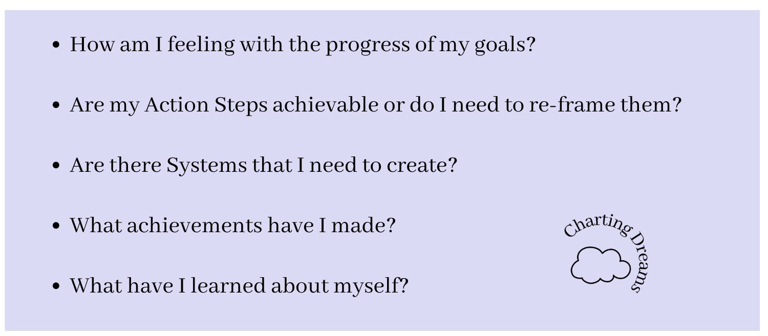 After creating a yearly vision board I find it’s helpful to have check-ins on a biweekly to monthly basis. This is to guide me to accomplish my goals. Here’s are some Journal prompts that you can include on your Vision Board to remind you to check- in.