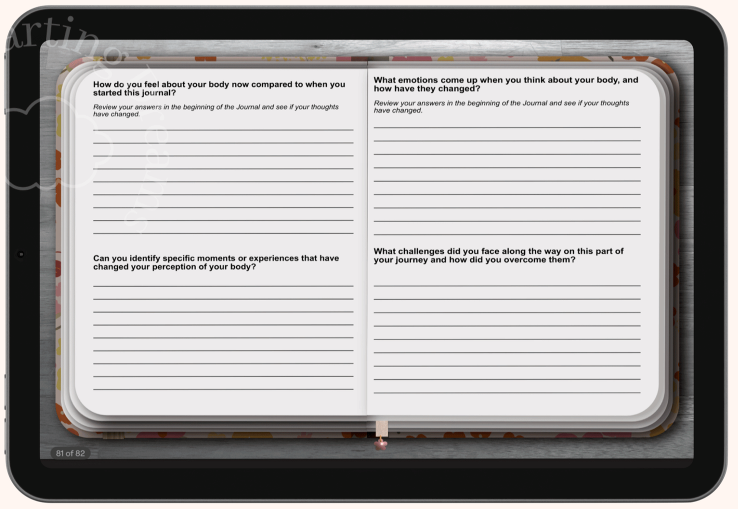 The Embrace your Reflection Journal is designed to help you find love in every part of your magnificent self. It’s designed for you to learn more about yourself, and as an aid to challenge negative thoughts associated with foods and/or a specific body image.