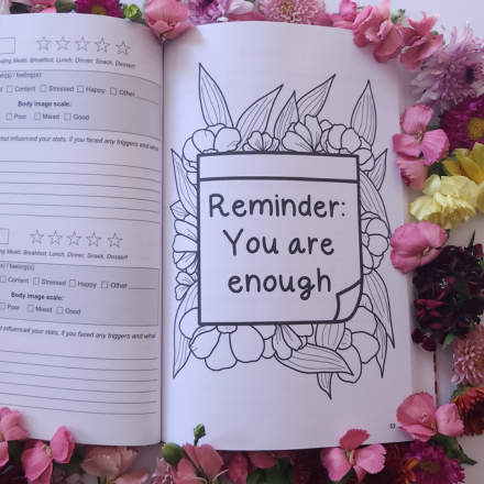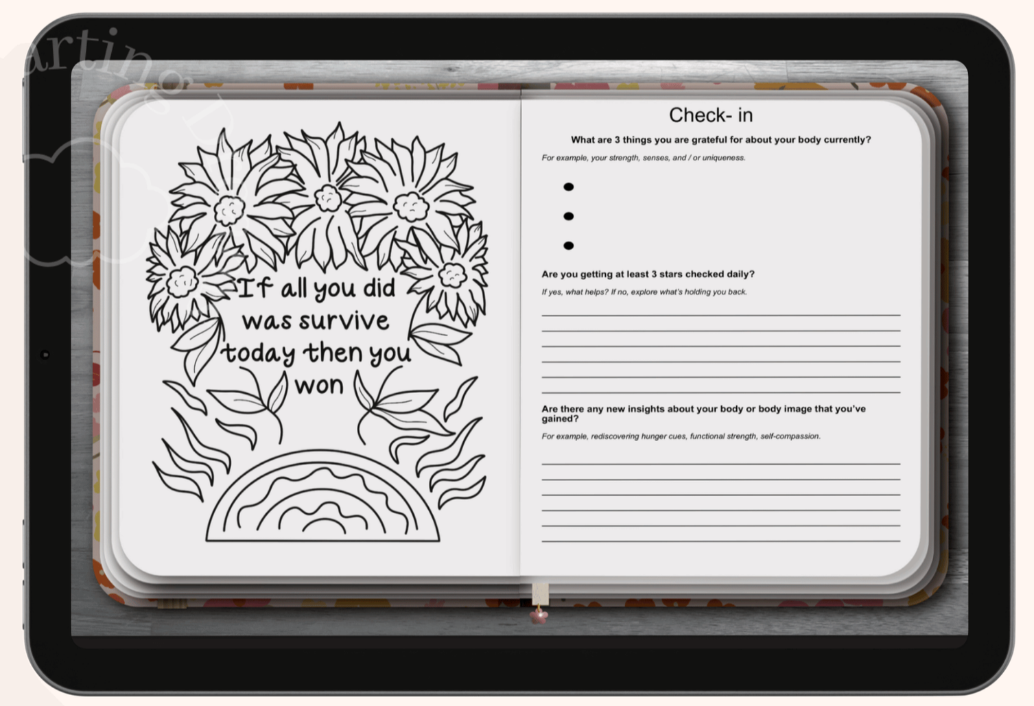 Within these pages you’ll find self-guided journal prompts, daily food logs with journal prompts and coloring pages with positive quotes.
